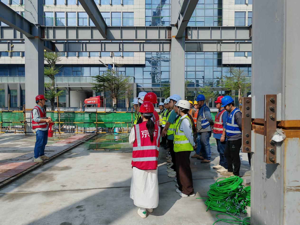 此次演练紧密结合项目施工特点,在演练现场设置了消防知识实操教学区。专业消防员针对施工现场常见的火灾隐患,详细讲解了灭火器的正确使用方法,并重点演示了钢结构焊接作业、易燃易爆材料存储等高危环节的防火注意事项。同时,结合海南冬季干燥多风的气候特点,着重强调了临时用电规范、动火作业审批、保持消防通道畅通等关键要求。现场员工积极参与实操练习,切实掌握了消防技能。