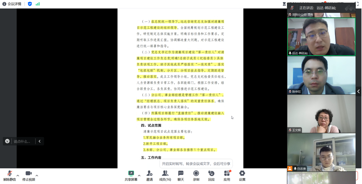为深入学习贯彻习近平总书记关于全面从严治党和反腐败斗争的重要论述,传达落实公司清廉项目示范工程建设启动会会议精神及相关工作部署,切实强化工程项目廉洁建设,12月12日,远达国际深圳、珠海分公司联合召开廉洁建设专项会议。分公司经理、职能部门负责人及项目总监出席会议。